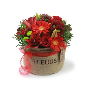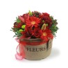 Grandària: Base amb 5 Gerberes, 5 Roses Vermelles , 2 Tiges de Lilium, 4 Tiges Margarides i Verds Ornamentals