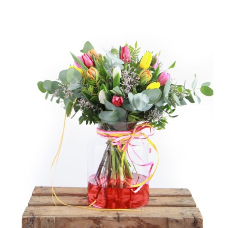 If you want to send a bouquet of tulips from our online florist is now easier than ever. We have prepared a selection of tulip bouquets of all colors, yellow, white, red tulips... to surprise you with this beautiful winter flower. Now, buying tulips online is very easy for you and it will be a great experience for whoever receives any of our exclusive and original floral arrangements with tulips.